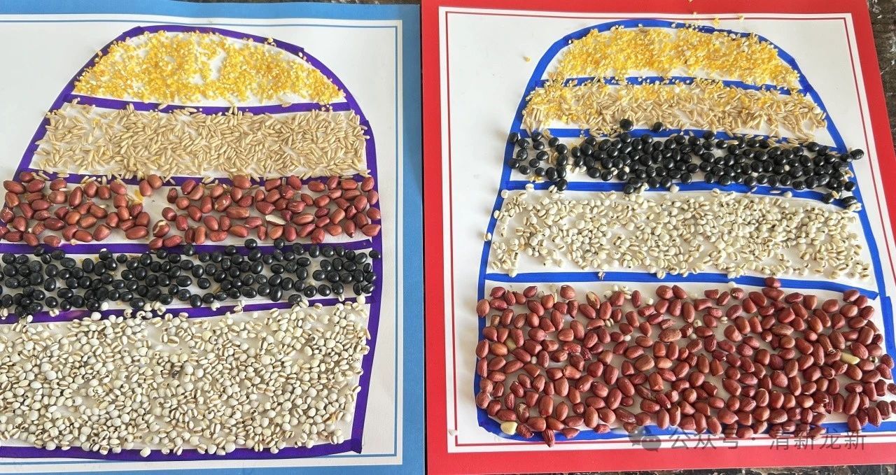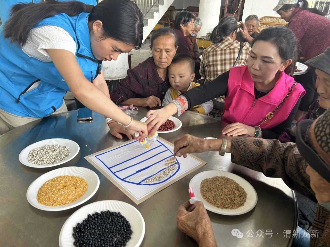 五谷共作画,饮食说健康。热身游戏后,是大家一起参与的互动,工作人员为老人们分发白乳胶、卡纸、五谷杂粮等材料,引导老人根据自己对健康饮食的理解,用五谷杂粮创作一幅画。清淡饮食用玉米、小米;低糖饮食用豆类、燕麦,很快,画纸上五彩斑斓呈现出大家的杰作。老人们争先展示,愉快讲述自己的创作思路。