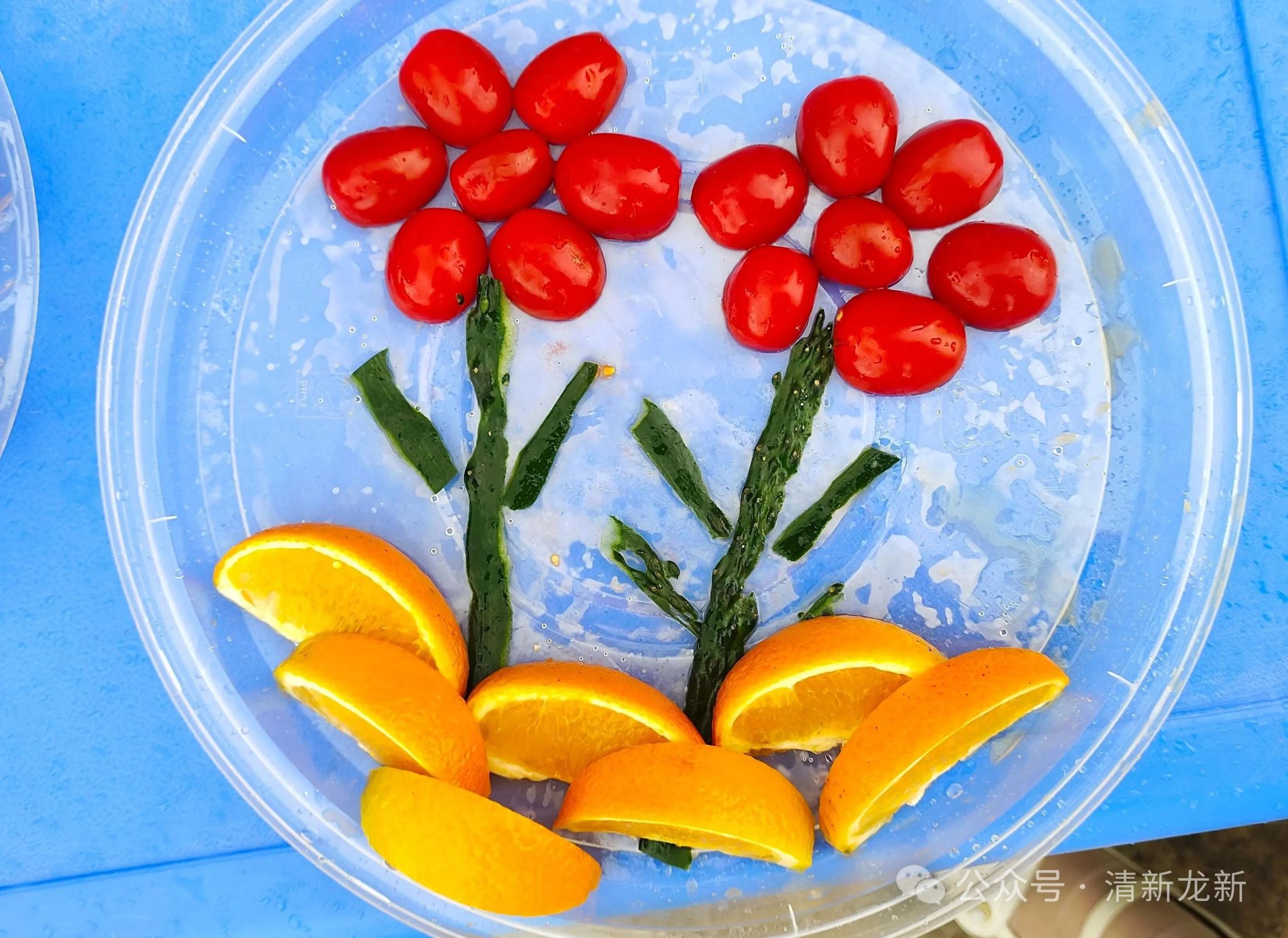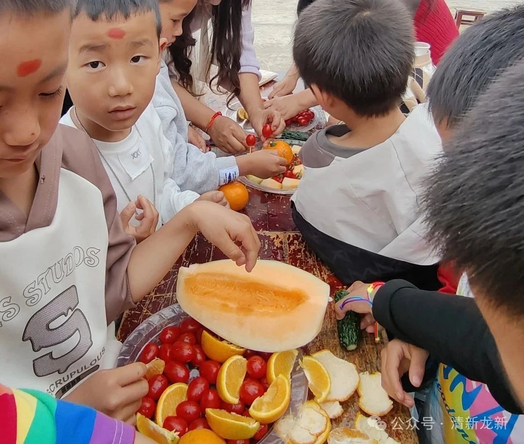 水果大变身,萌娃秒变“小厨神”。老师提前为孩子们准备了干净的黄瓜、圣女果、哈密瓜、橙子等新鲜水果。孩子们围站在桌子旁,在老师的引导下,孩子们拿起安全水果刀,小心翼翼地切着水果。有的将橘子摆成花朵,有的把圣女果装饰成小刺猬,还有的用黄瓜和橙子拼出笑脸图案。老师们在一旁耐心指导,协助幼儿完成创意造型,欢声笑语中,一个个造型独特的水果拼盘逐渐成型:“彩虹桥”“小火车”“花朵城堡”......每一份作品都凝聚着孩子们的奇思妙想。当色彩鲜艳、造型可爱的水果拼盘完成后,孩子们迫不及待地围坐在一起,分享自己的劳动成果。他们互相品尝着同伴制作的水果,叽叽喳喳地讨论着谁的拼盘最漂亮,脸上洋溢着满满的成就感。