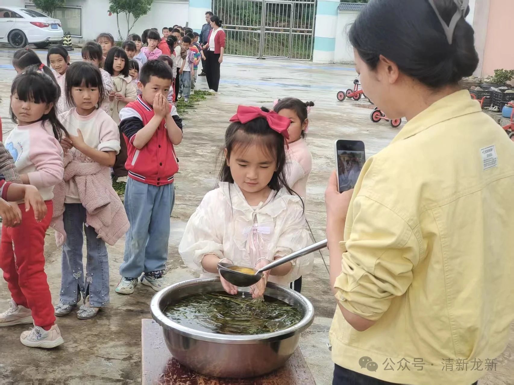 木兰汤洗手,避岁驱邪祈平安。老师们提前用采摘的艾草煮好“木兰汤”,温热的汤汁散发着艾草的清新气息。活动中,老师们用小瓢舀起木兰汤,轻轻为每位幼儿洗手。汤水流过小手时,老师轻声讲解“避岁驱邪、端午安康”的寓意,孩子们认真地伸出小手,感受着传统习俗的温暖仪式感。