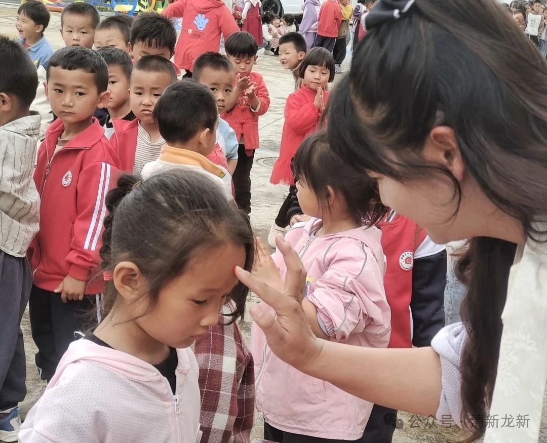 点朱砂,额间红点寄安康。老师用棉签蘸取朱砂,轻轻点在幼儿额头正中央,化作一枚鲜红的“平安痣”。“点朱砂,保平安”,老师们一边点着一边温柔地祝福,孩子们对着镜子好奇地触摸额间的红点,脸上洋溢着天真的笑容,这颗红点不仅是健康平安的象征,更让他们感受到传统文化的独特魅力。