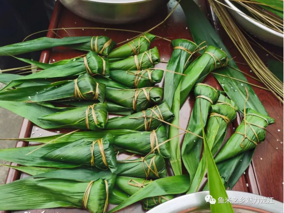 中午13时,包粽子比赛正式开始,大家围在一起,纷纷拿出看家本领,就着准备好的原材料,折叶的折叶,扎线的扎线,捋粽叶、做漏斗状、填糯米、压紧实、封口、扎捆,一张张翠绿的粽叶在参赛者手中翩翩起舞,忽而四四方方,有棱有角;忽而又一头尖尖,好似龙角,一个个有模有样的家乡粽子迅速成型,现场被欢乐和谐的节日气氛包围,其乐融融,虽说是比赛,但现场气氛融洽和谐,大家有说有笑,互相交流着包粽子的技巧,洋溢着温暖情谊。