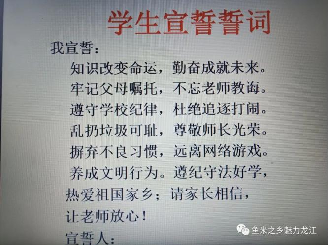 “我宣誓:知识改变命运,勤奋成就未来。牢记父母嘱托,不忘老师教诲……养成文明行为。遵纪守法好学,热爱祖国家乡;请家长相信,让老师放心!宣誓人:”由培训老师带领同学们一起宣誓,激励斗志!