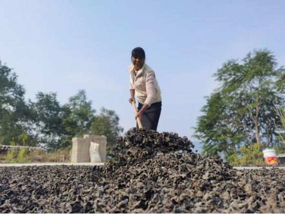 挂村领导、村“两委”和驻村工作队一大早来到地头,查看大家采收木耳的情况。陈吉位家的木耳地位于山脚下龙江湖畔的田块上,他的母亲和妻子专门采摘木耳,他主要负责将采摘下来的木耳背到田头的垫子上晾晒开来。