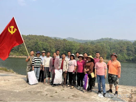 中午时分,杨梅坡水库党旗迎风飘扬,社区工作人员、党员手持锄头、扫把、铁铲、刀、编织袋,发扬不怕脏、不怕累的精神,不遗余力,相互配合,仔细对引水沟里的枯枝落叶、淤泥、杂草、白色垃圾等进行捡、砍、铲、挖处理,并呼吁附近群众对在河湖内乱扔垃圾、游泳等不文明行为进行抵制,呼吁大家共同维护良好的河湖生态环境。
