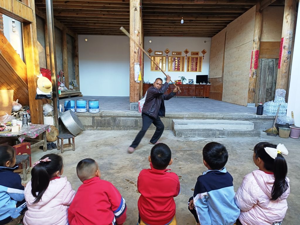 在推进非遗进校园工作中,龙江乡中心幼儿园不仅组织师生代表前往龙江傣族花棍第一代传承人肖太强家中,深入学习花棍的起源、制作工艺及表演套路,还特邀专业的傣族花棍老师进入校园,亲自传授表演技艺,全园10名教师与158名学生均积极参与其中,他们或挥汗如雨地练习动作,或聚精会神地聆听讲解,共同领略花棍的魅力。