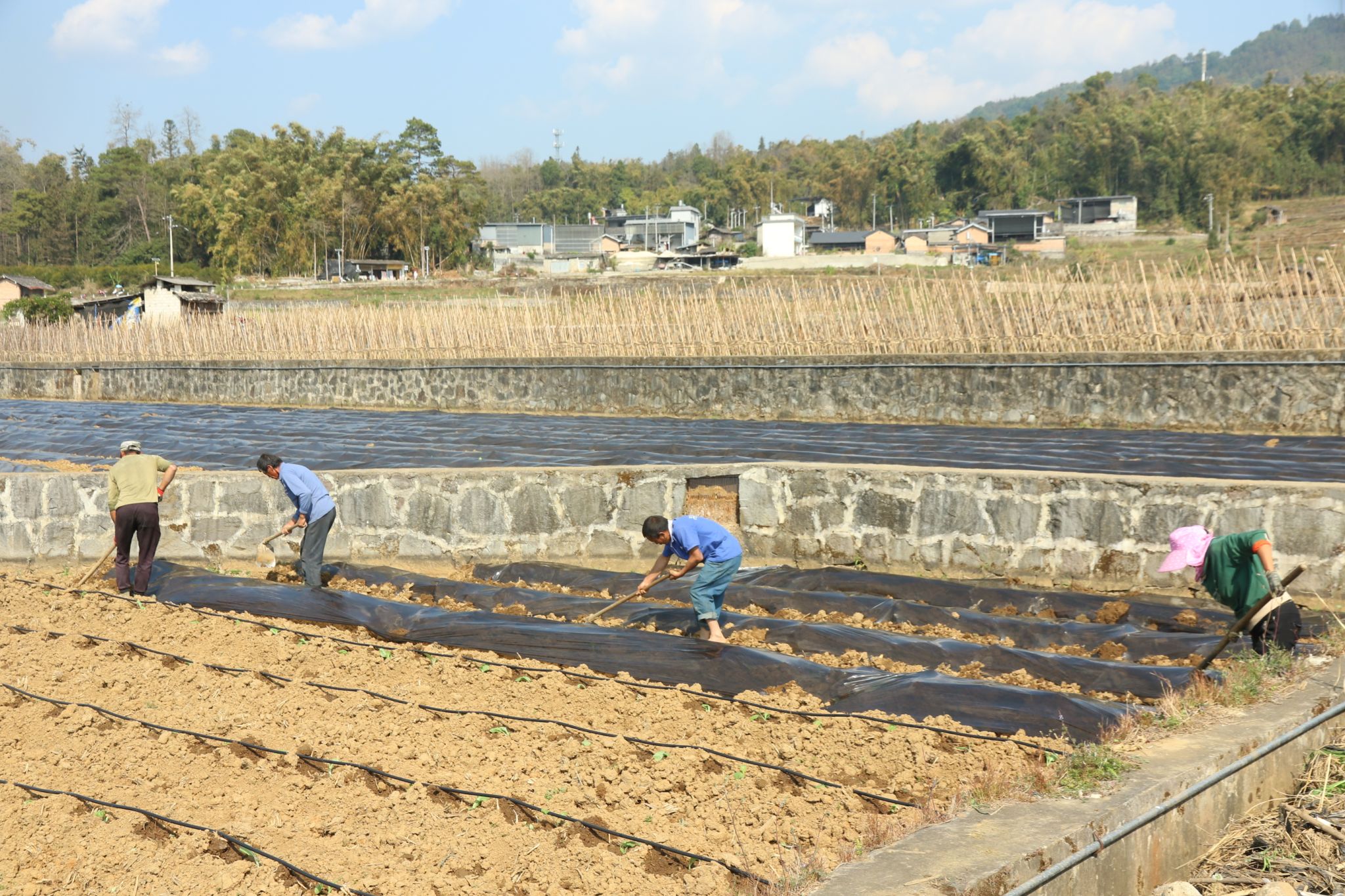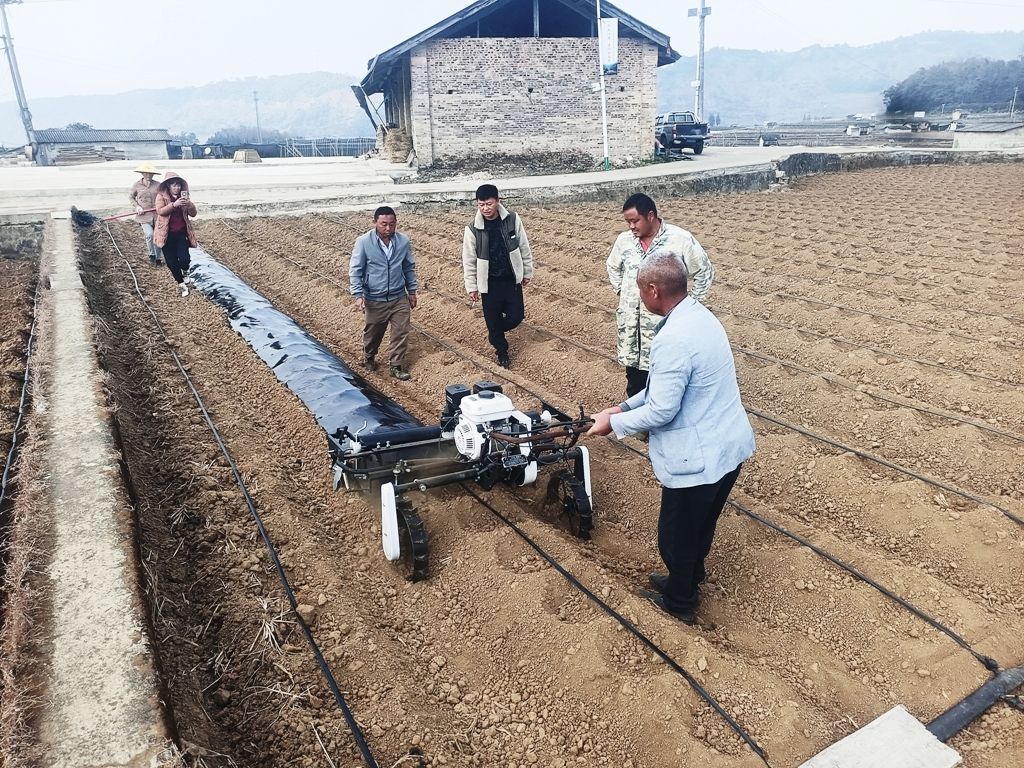 在烟地的另一处,机器覆膜作业有序进行。一台台小型覆膜机在田间快速前行,转眼间,塑料薄膜被精准铺设在烟地上。机器覆膜不仅效率高,而且能更好地起到保温、保湿、保肥作用,有效应对春季气温波动,为烟苗生长创造良好条件。烟农张大姐感慨道:“现在用上机械设备,移栽更省力,专家还手把手教技术,今年增收更有底气!”