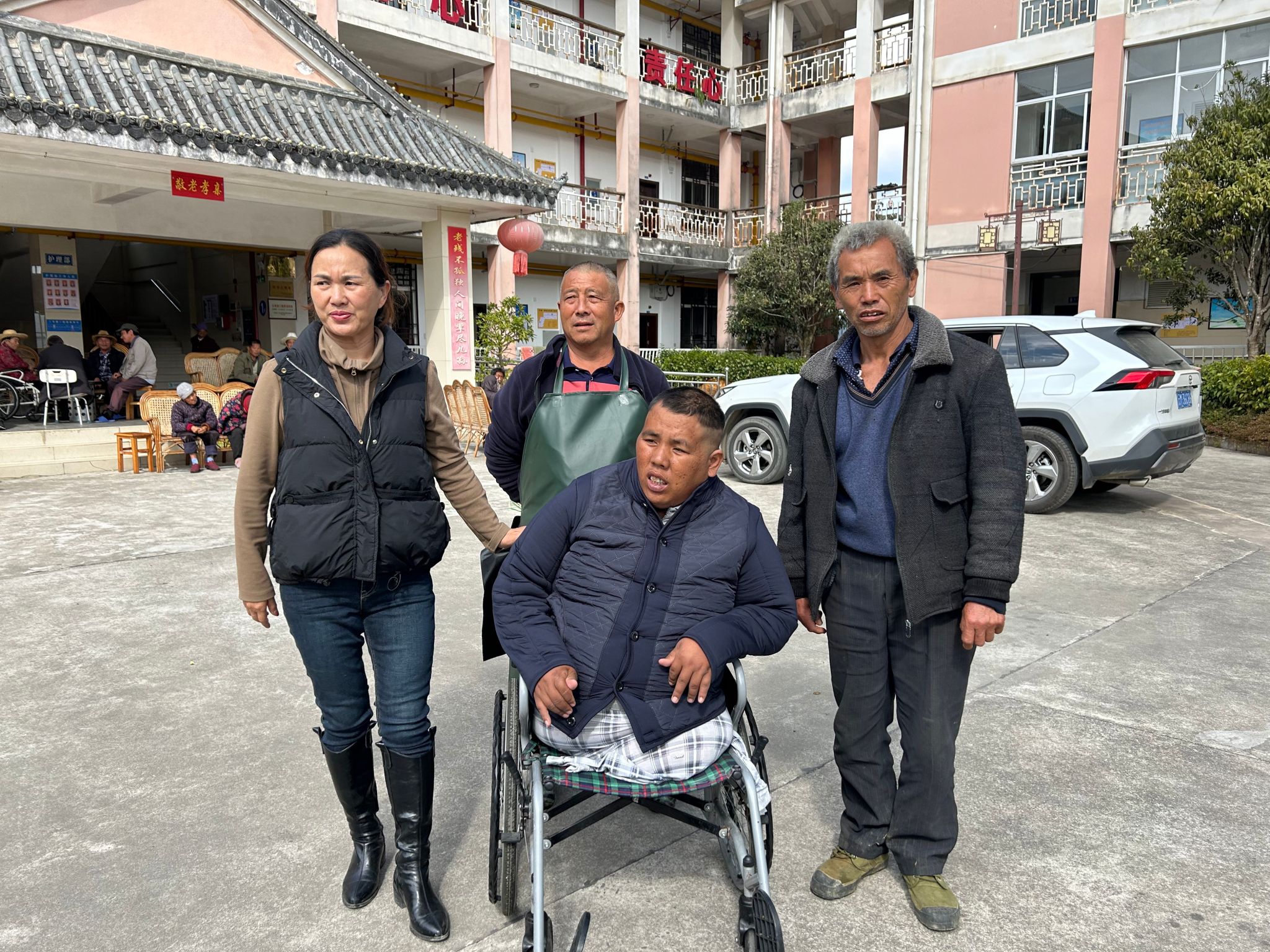 但我没有被这小小的阻碍击退,我知道,只要坚持,就一定能为张大泽找到幸福的方向。2024年11月1日,我约了龙陵县残联的原副理事长王星看望张大泽。在了解到他的困境后,我们一起想办法找路子。2025 年 1 月 14 日,我早早地来到张大泽家,小心翼翼地帮他坐上我的车,然后接上他父亲张文平,一同前往龙陵县中心敬老院。一路上,张大泽的眼睛始终望着窗外,眼神中透着紧张与期待,他的手指不停地在膝盖上轻轻敲击,那是他内心不安的表现,又像是对未来生活的一种急切期盼。