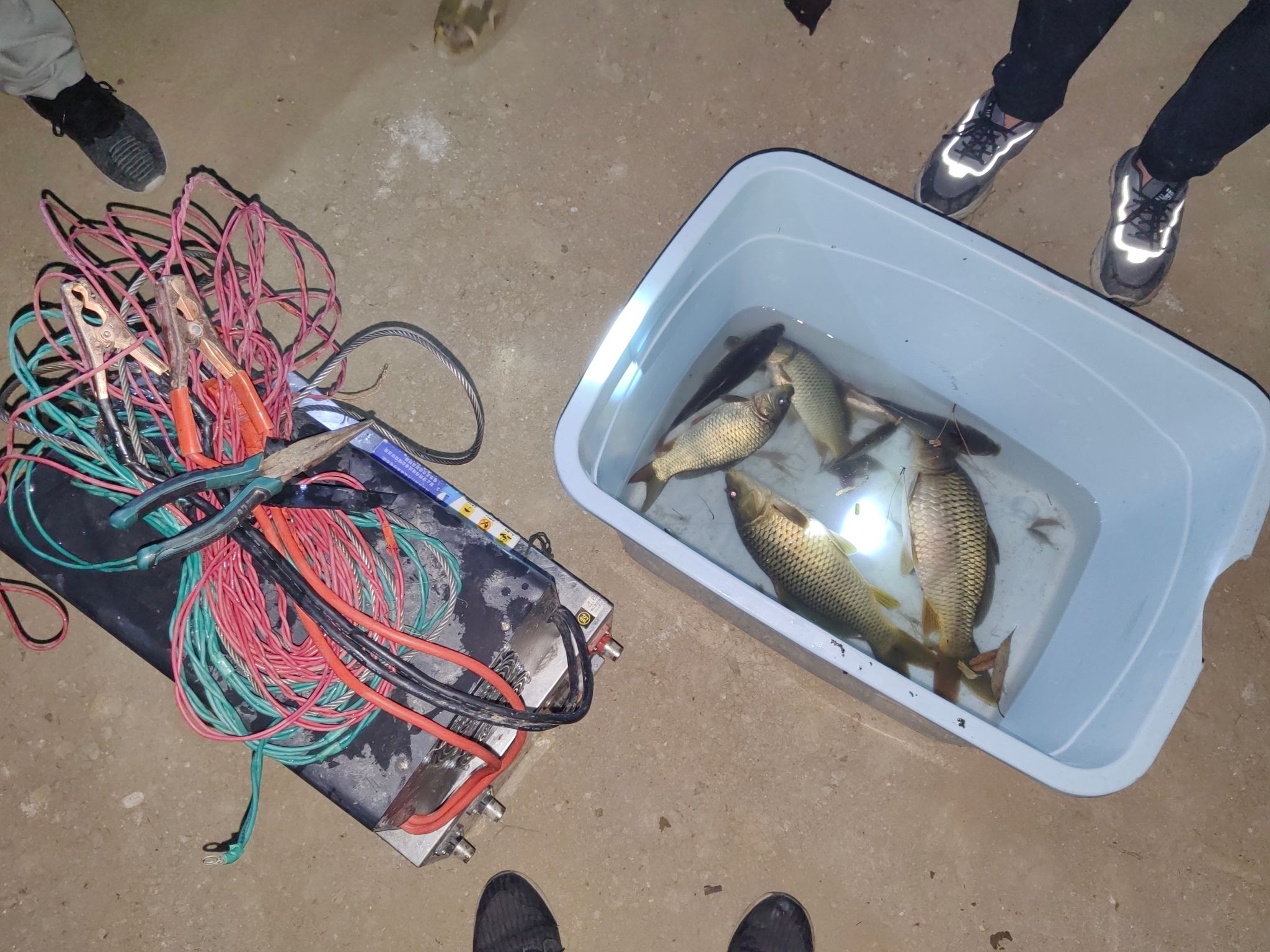 龙江乡执法人员根据群众举报线索迅速行动,到达现场后,执法人员发现两名违法嫌疑人杨某某和板某某正驾乘竹筏在水域中实施电鱼行为。执法人员当场制止其违法行为,当场查获电鱼设备1套、渔获物6斤。