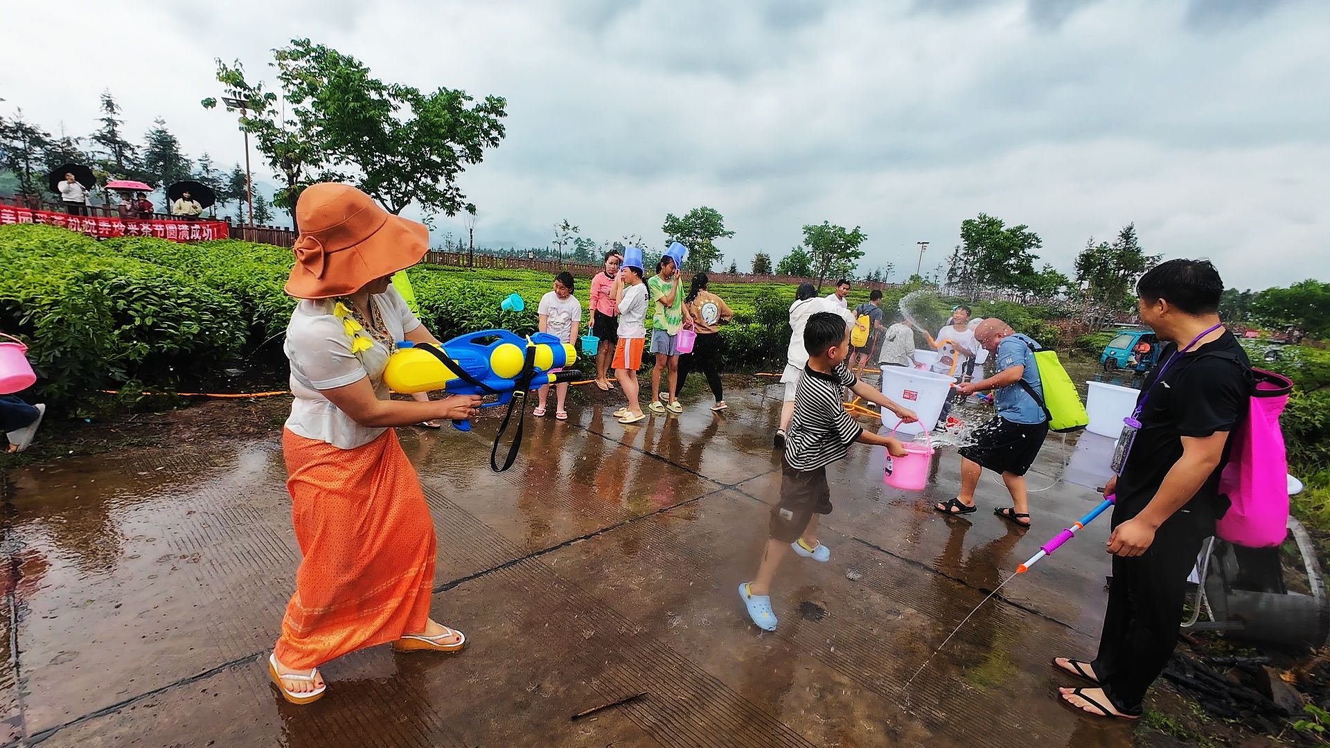 随着活动开始声起,瞬间化作欢乐的战场。大家各自拿好工具,向人群洒出晶莹的水花,寓意洗去尘埃、带来好运;小伙子们则高举水枪,组成“战队”与对手展开激烈的“水战”,游客们也不甘示弱,迅速加入激烈的“水战”中,欢呼声与泼水声交织成激昂的节日乐章。年轻的父母带着孩子,手持小桶和水盆,小心翼翼地将清水泼向同伴。孩子们清脆的笑声在茶园上空回荡,他们用稚嫩的双手传递祝福,而大人们也默契地以轻柔的回泼回应,水花中满是温情与欢乐。