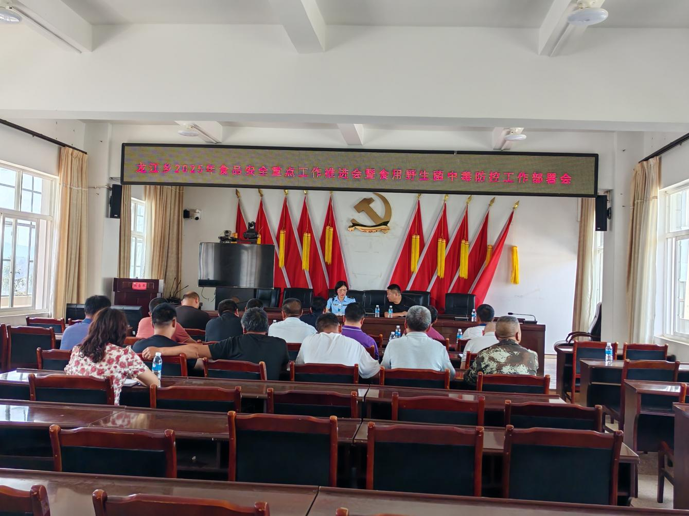 2025年6月12日,龙江乡召开食品安全重点工作推进暨食用野生菌中毒防控工作部署会,相关部门负责人、各村食品安全信息员共计30余人参会。