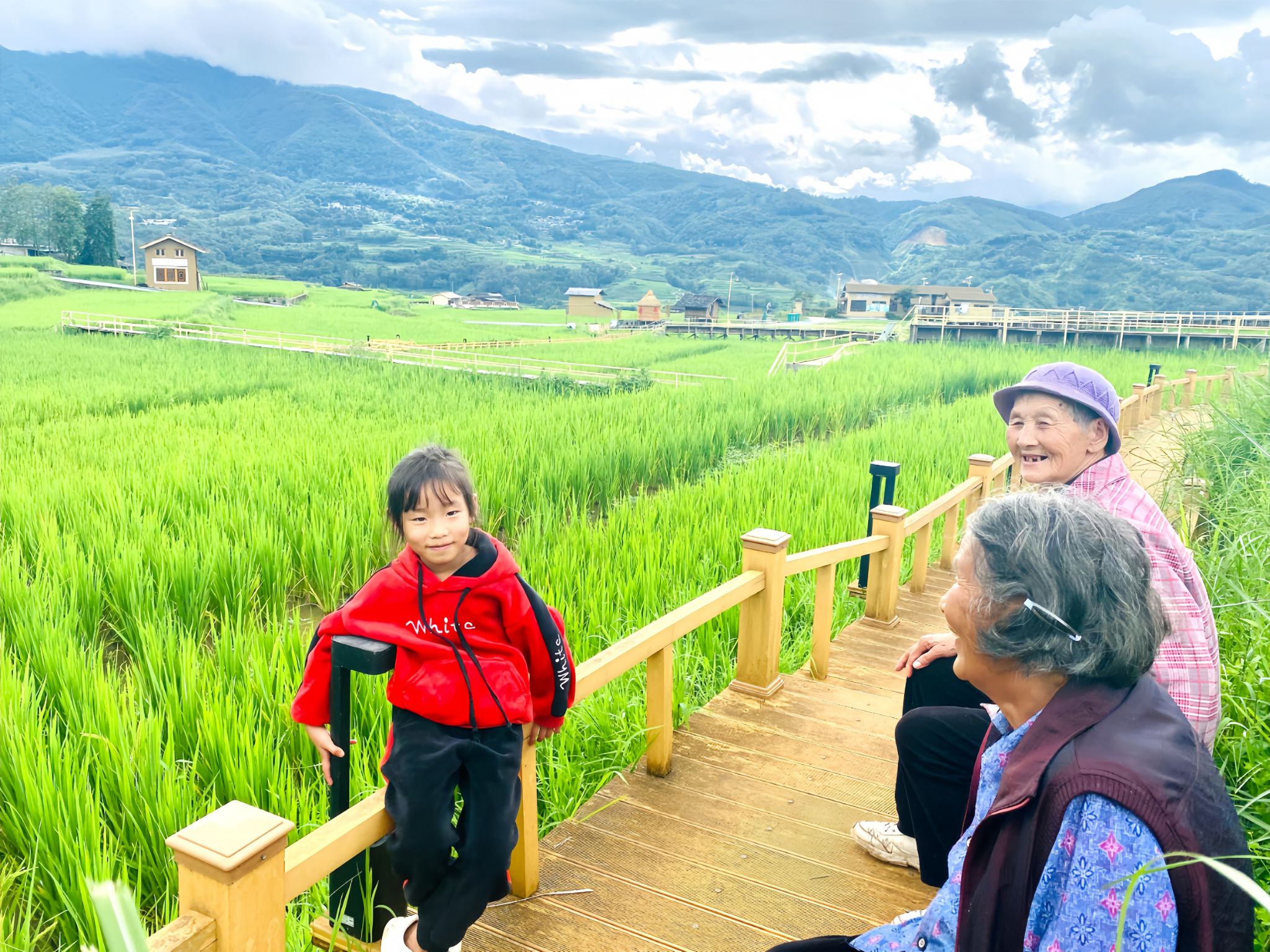 这里的田埂蜿蜒,大地随手勾勒,没有规整的几何线条。脚下的泥土软糯,带着些许湿润。凑近稻谷细看,挂着晶莹露珠的叶子,在阳光的轻抚下熠熠生辉。走着走着,瞧见几位农人正在稻田里忙碌。他们头戴斗笠,挽起裤脚,俯下身子,踏入田里清理了杂草,黝黑的皮肤在阳光下泛着光泽。几个孩童举着带蜘蛛网的竹竿追蜻蜓,笑声撞碎在稻叶间,落回田里。