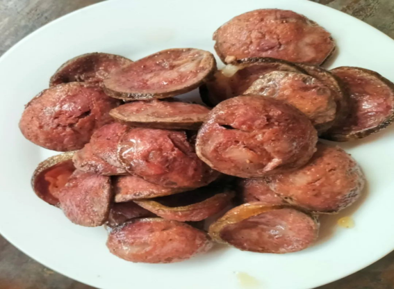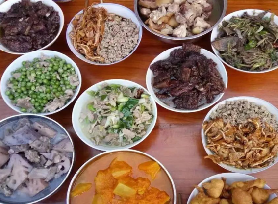 血烩肉也是腊勐的一道特色菜,年前的杀猪饭上,家家户户都少不了这道菜,血烩肉颜色呈紫色,吃起来鲜、嫩、香。做法简单,杀猪的时候准备两三斤笋子,将鲜猪血淋在笋子里拌匀,然后再把煮熟的三线肉和炝好的笋子烩在一起,煮半个多小时便可以食用。