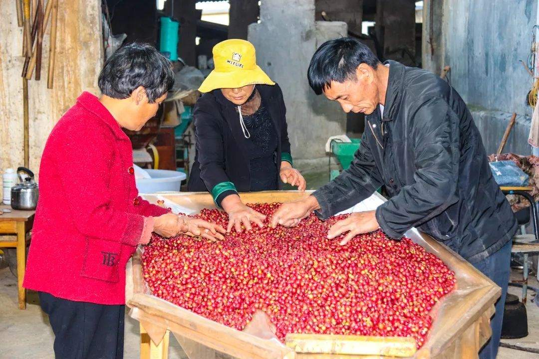 “1领”聚力,提升“庭院经济”发展动能。松山村党总支以党组织领办合作社为抓手,以庭院经济为突破口,积极探索“党组织+产业+合作社+电商+群众”模式,构建起“党群联动、庭院增效”的振兴格局,有效破解咖啡产业种植技术水平参差不齐、销售渠道不稳定、联农带农效能不足等问题,推动产业升级、合作社实体化运营、电商提质增效与群众持续增收,实现从“单点突破”向“领航聚势”跃升,为乡村振兴注入“红色动能”与“绿色活力”。“5促”赋能,打破“庭院经济”发展瓶颈。松山村极咖合作社通过促“平台搭建、技术提升、示范带动、业态丰富、氛围营造”的模式,构建集产销对接、技术支撑、示范引领、业态融合、流量吸引于一体的产业生态体系,推动“方寸庭院”蝶变为乡村增收致富的强劲新引擎。促平台搭建。引进云南原膳农业开发有限公司、云南希音咖啡有限责任公司等龙头企业,搭建企业合作平台,签订定向收购协议,打通咖啡等农产品产销链路。依托短视频推广、文旅节庆等宣传载体,搭建宣传推介平台,多维度提升农产品知名度与市场吸引力,精准对接消费需求,拓宽销售渠道。借助专业电商运营团队,搭建电商推广平台,开设“庭院直供”线上销售专区,将庭院产出的咖啡豆、腌制品、芒果干、柿饼等农特产品直接推向消费者,提升农产品流通效率。促技术提升。通过产业专项技能培训和常态化入户指导,系统提升群众种养及加工技术水平。重点培训咖啡标准化种植、晾晒、分拣、加工等流程,同步指导生猪肉牛养殖、腌腊加工、柿饼晾晒等技术,为庭院经济注入坚实技术支撑,推动农家院落升级为集生产、加工于一体的“前店后厂”式微型工坊。目前已开展咖啡种植、生猪养殖、农作物种植与加工等培训9场次,覆盖1100余人次。促示范带动。构建“1+6+N”示范带动模式,即优选核心咖啡产业示范户,联动生猪、肉牛、腌腊、柿饼、多肉、兰花等6类特色产品示范户,共同打造多元化融合发展的产业矩阵。通过“示范户先行试点—经验复制推广—散户全域跟进”的辐射扩散路径,从单户示范到集群成势,有效提升庭院经济规模化、协同化发展水平。促业态丰富。以咖啡产业为核心,辐射带动柿饼、腌腊、芒果干、生猪、肉牛等特色农产品规模化发展,持续培育民宿、农家乐、互动体验、研学等新业态,推动单一农产品销售向“农业观光+体验消费+文化服务”综合业态升级,让多元业态成为群众致富的新增长点。促氛围营造。引导群众利用房前屋后闲置空间种植咖啡,打造“咖啡微景观带”,实现生态美化与经济创收双赢。在庭院内嵌入咖啡主题装饰,陈列咖啡豆、文创产品等,开发手作、品鉴等互动项目,构建“推门见绿、入室品咖”沉浸式场景,让咖香成为引流留客的“流量密码”。