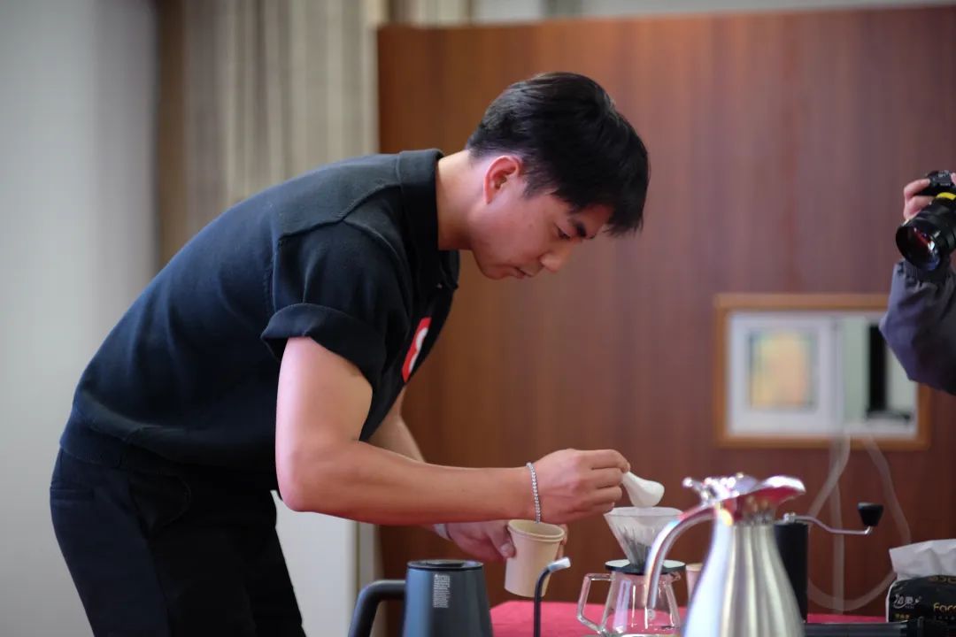 比赛现场,选手们个个全神贯注,每一个步骤都精益求精。磨豆、烧水、打湿滤纸、闷蒸、注水......在选手们的精心操作下,冲泡的咖啡散发出浓郁的香味,弥漫在整个赛场,令人陶醉。