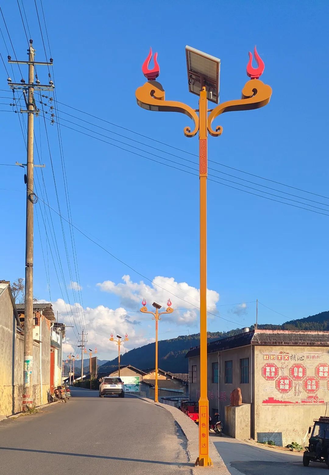 太阳能路灯不仅安装较为简便,还能起到很好的节能效果,为村里节约大量的电费和维护费用。路灯设计成金色火炬的样子,金色的座身在蓝天的映衬下显得修长挺拔,基座上写有红色象达四个字,顶部左右两朵金色的祥云上跃动着两簇红色的火苗,象征着革命火种生生不息。