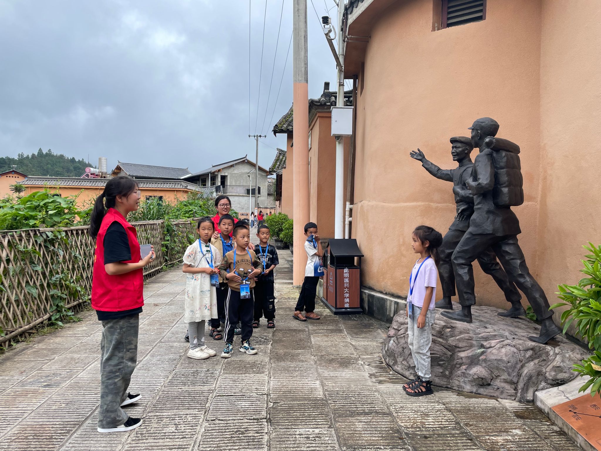 在参观的同时,大学生志愿者们为孩子们佩戴上“朱家庄红色景区小小讲解员”的胸牌,并对他们进行了一对一的讲解培训。志愿者认真负责,孩子们热情高涨。通过实地培训和实践,让孩子们学会如何以自信的姿态、流畅的语言向游客介绍朱家庄的红色历史与文化,成为传播红色基因的小小使者。在这一过程中,他们的语言表达能力得到了显著提升,文化自信也得到了极大地增强,更让他们对家乡的历史与文化有了更为深刻地理解。大学生与孩子们携手同行,以“大手牵小手”的方式,共同为红色基因的传承与革命精神的弘扬贡献着力量。每一个参与的大学生志愿者、每一个小学生,都成为了家乡红色故事的宣讲人,他们就像那星星之火,点燃了红色文化的热情,为家乡的经济发展与乡村振兴注入了新的动力。