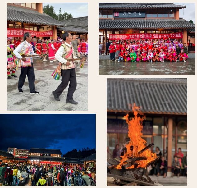晚上七点,群众自发性文艺演出隆重登场,红歌、红舞相继开场,熊熊的篝火在象达镇游客服务中心前的空地上燃起。傈僳族传统音乐传承人吹起悠扬笛声,弹起悦耳动听的三弦,跳起欢快的舞步。50多名身着绚烂民族服饰的象达舞蹈队员和从四面八方赶来的笑意盈盈的村民们兴致勃勃地加入了欢乐的打歌队伍。围成圆圈,跟随打歌师傅,随着美妙动听的音乐,踩着音乐的节奏,每个人脸上洋溢着灿烂的笑容,欢声笑语汇成欢乐的海洋。