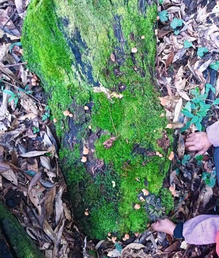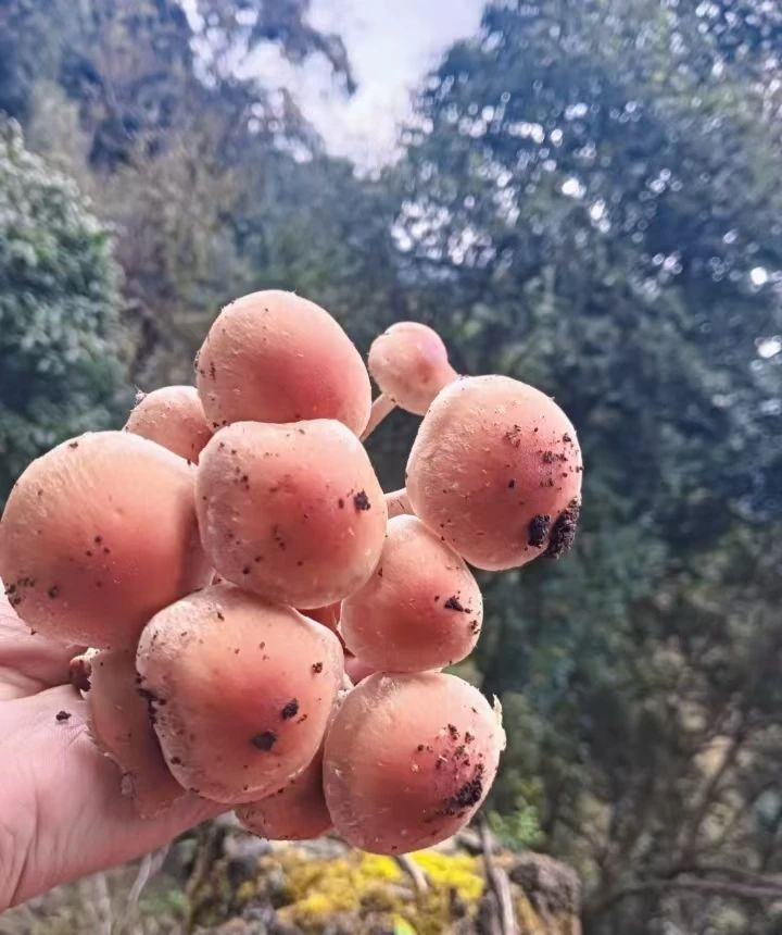 山间的小路被落叶覆盖,只有零星的脚印显示出有人曾走过。大妈手持一根长棍,小心翼翼地拨开落叶,仔细地寻找着冬菌的踪迹。我则跟随着她的脚步,好奇的打量着冬菌生长的神秘世界。在一棵腐朽的大树根旁,大妈停下了脚步,她的目光瞬间锁定在了那几个小巧的黑褐色菌帽上,那是冬菌在树皮下静静地等待着被发现。大妈用棍子轻轻拨开周围的覆盖物,随后以小刀轻柔地挖出冬菌,将它们小心翼翼地放入随身携带的布袋中。大妈告诉我,冬菌对生长环境极为挑剔,它们喜欢长在高海拔原始森林腐烂的栎树根中,数量稀少且味道极其鲜美,回到村里就会被一扫而光,市面上基本买不到野生冬菌。