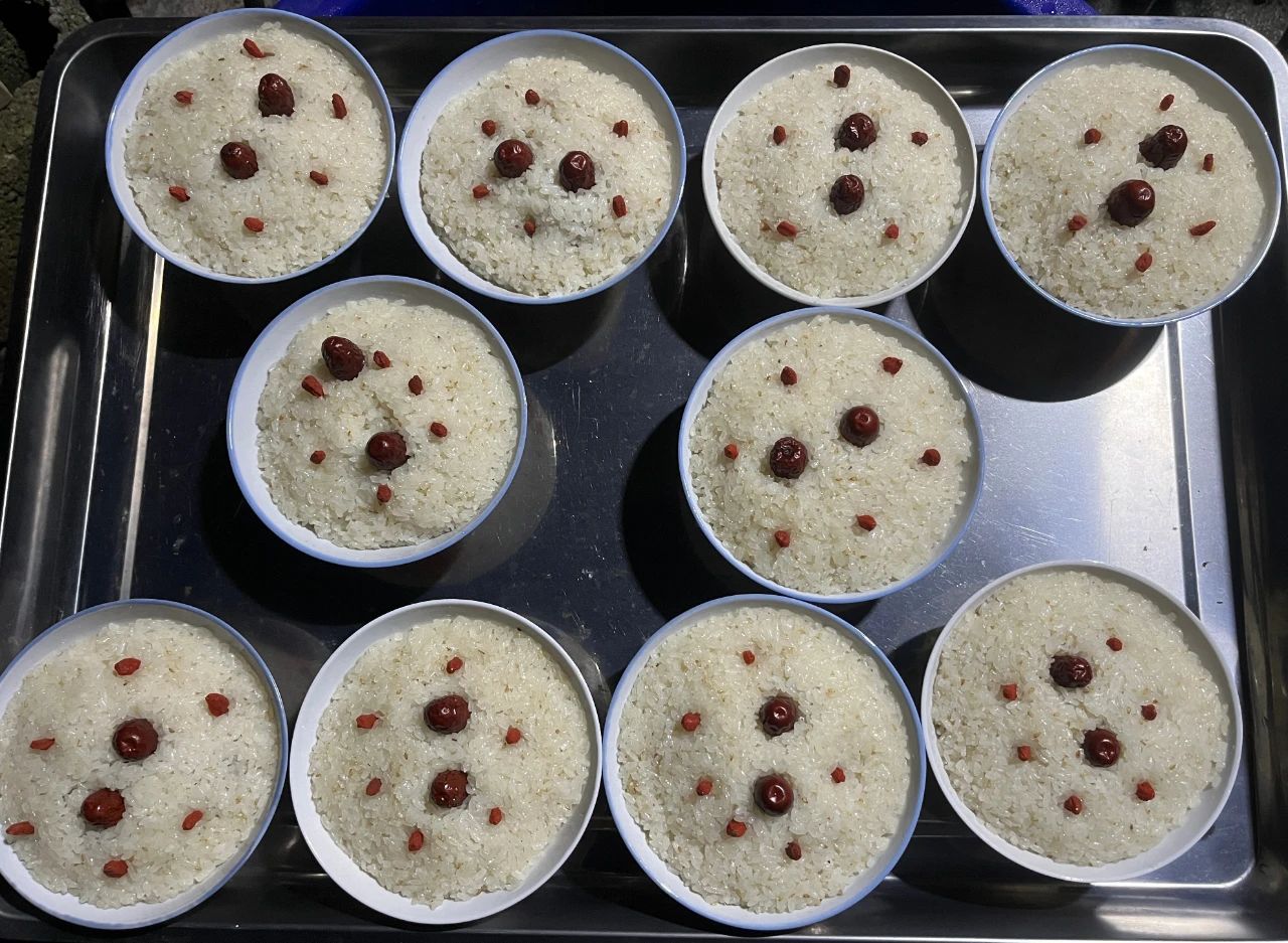 每逢喜事,主人家会制作一碗碗香喷喷的八宝饭,八宝饭选用颗粒饱满均匀的圆糯米,将其拌上芝麻和猪油,放入碗具中,在糯米上放入大枣、枸杞、莲子、瓜子仁、葡萄干等果料,放入蒸笼蒸四十分钟后,便可食用,吃起来软糯香甜,让人心里暖滋滋的。八宝饭蕴含着吉祥如意、早生贵子的含义,深受大众的喜爱。