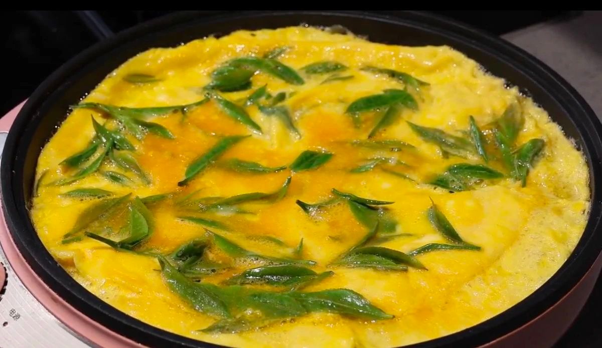 鸡蛋打入嫩茶中,搅拌均匀,加入适量调料。出锅后的茶叶煎蛋,色泽金黄,茶叶的清新中和了鸡蛋的油腻,口感松软,充满了夏天的气息。