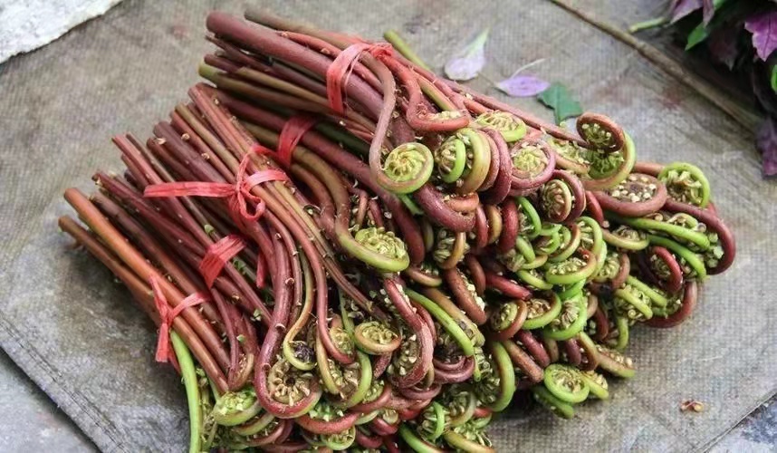 蕨菜,其叶芽、嫩茎营养丰富,富含人体需要的多种维生素,食用前经沸水烫后,再浸入凉水中除去异味,便可食用。经处理的蕨菜口感清香滑润,再拌以佐料,清凉爽口,是典型的绿色食品。