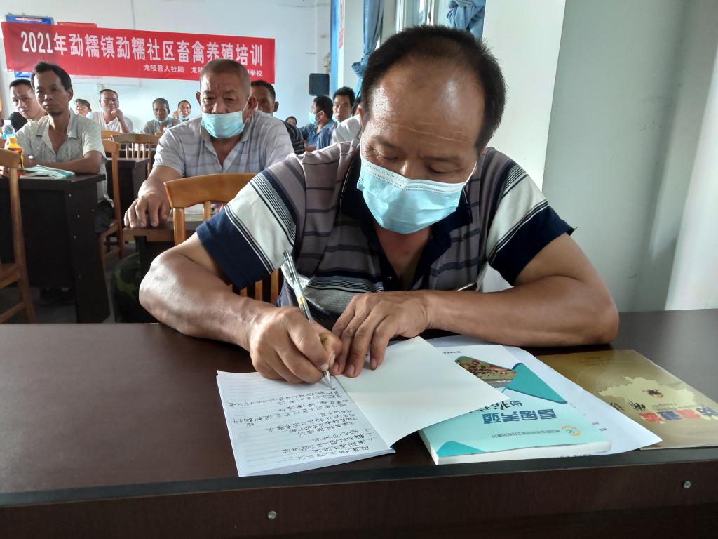 爱学习的郭能云认真听讲的同时也不忘记笔记,他说:“授课老师讲得很实在、接地气、听得懂,对我肉牛养殖发展非常有帮助,今后要把学到的专业知识带到实际生产中”。