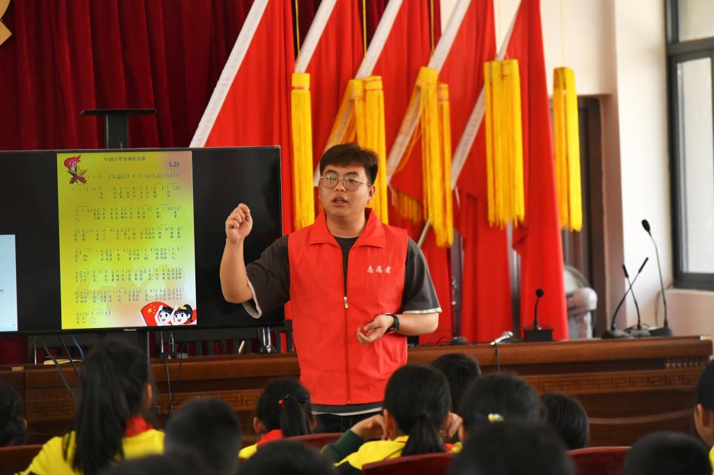 在职教师加入了志愿者队伍,从基本的发音标准教起,到最后孩子们可以完整准确合唱《我和我的祖国》《我们是共产主义接班人》等歌曲。