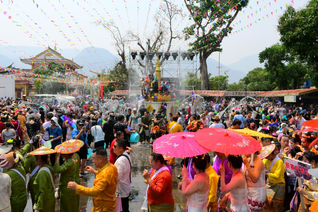 泼水节是傣族一年中最盛大的传统节日,活动期间在进一步发展乡村旅游的同时也传承和保护了民族文化。傣家人穿上节日盛装,采花、堆沙、洗佛,手提水桶,手持鲜花向贵宾、长者、亲友、路人泼洒祝福之水。社区举办全国“四季村晚”示范展示,组织陀螺、罩鱼、斗鸡等竞技赛,营造浓厚的节日气氛。傣韵古道成为特色展销一条街,各色小吃、农特产品琳琅满目,小海湿地公园里划竹筏、游花海、赏灯火,满足了八方来客游玩需求。