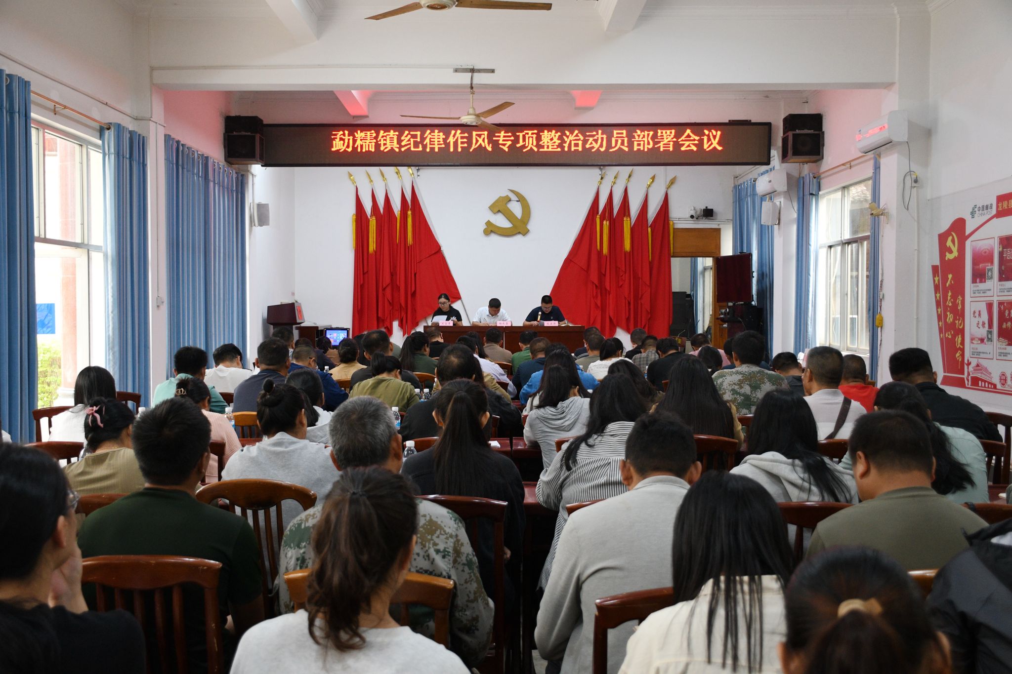为全面落实全面从严治党有关要求,进一步加强全镇干部职工纪律作风建设,提高干部工作效能,10月15日,勐糯镇组织召开纪律作风专项整治动员部署会议,动员全镇党员干部切实从思想认识上紧起来、纪律规矩上严起来、突出问题上改起来、作风能力上强起来,持续巩固风清气正的政治生态。全镇干部职工、村(社区)“两委”成员、驻村工作队共120余人参加会议。