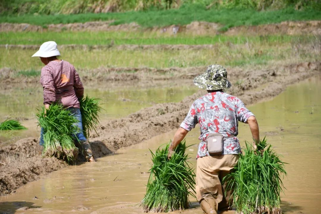 日头渐高,蝉鸣阵阵,暑气蒸腾。田间的人们顾不上擦拭额头滚落的汗珠,专注于手中的秧苗。一株株新插的秧苗在泥水中扎根,嫩绿的新叶舒展身姿,为水田披上崭新的绿装。放眼望去,新绿在勐糯坝子上不断蔓延,生机盎然。
