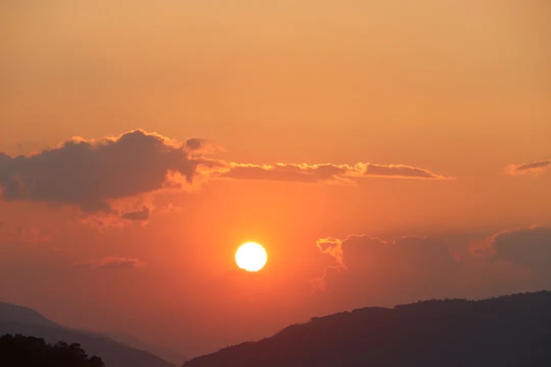 在落日弥漫的傍晚,太阳已不再有刺目的光芒,闲步走在山间的小路上,会遇见烟霞笼罩着的远山,显得格外瑰丽;会遇到晚霞为树影披上一抹紫色面纱,显得格外神秘;会遇到薄薄的霞光映照在身上,散发出温柔岁月般的美好。站在没有树木遮挡的地方,日落的瞬间,便能清晰看到太阳像是一只又圆又红的大苹果高傲地悬在天边,一朵朵黄澄澄的云衬着太阳,阳光透过云缝洒出来,一切都变得红红的,像着了火一般,沐浴在红艳艳的阳光中,时间仿佛都在此刻停止,一阵清风袭来,人也沉醉在夕阳的最后一瞥里。