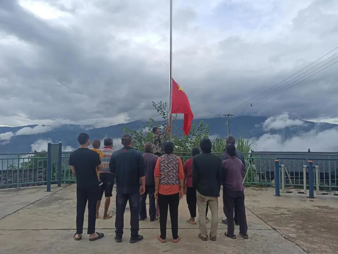 木城乡党委政府协同木城边境派出所、卫生院、信用社等驻木单位与联防所、各村同步举行庄严的升旗仪式。全体党员佩戴党员徽章,整齐排列,在激昂的《义勇军进行曲》中,鲜艳的五星红旗缓缓升起,党政军民共同仰望国旗,齐唱国歌,场面庄重而严肃。随着国旗的升高,爱国之情油然而生,大家纷纷为祖国的繁荣富强献上衷心祝福,共同期盼祖国更加昌盛。通过升旗仪式,群众的爱国情感和民族自豪感得到了进一步强化,为这一全国欢庆的日子增添了庄严氛围。