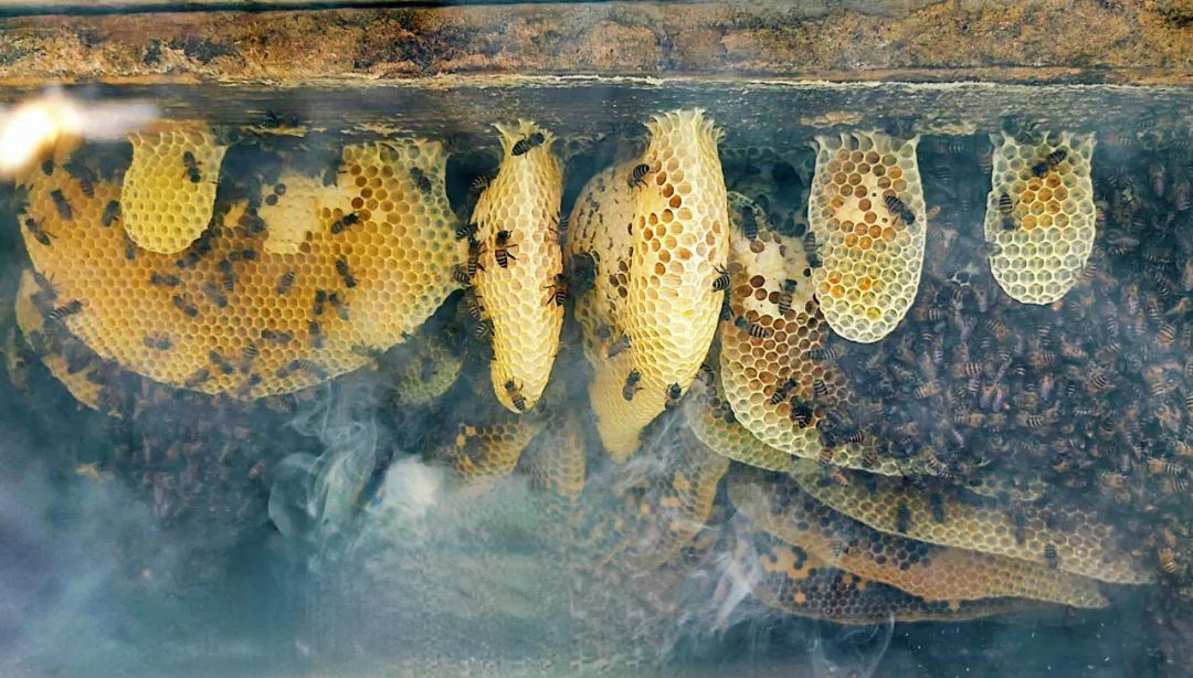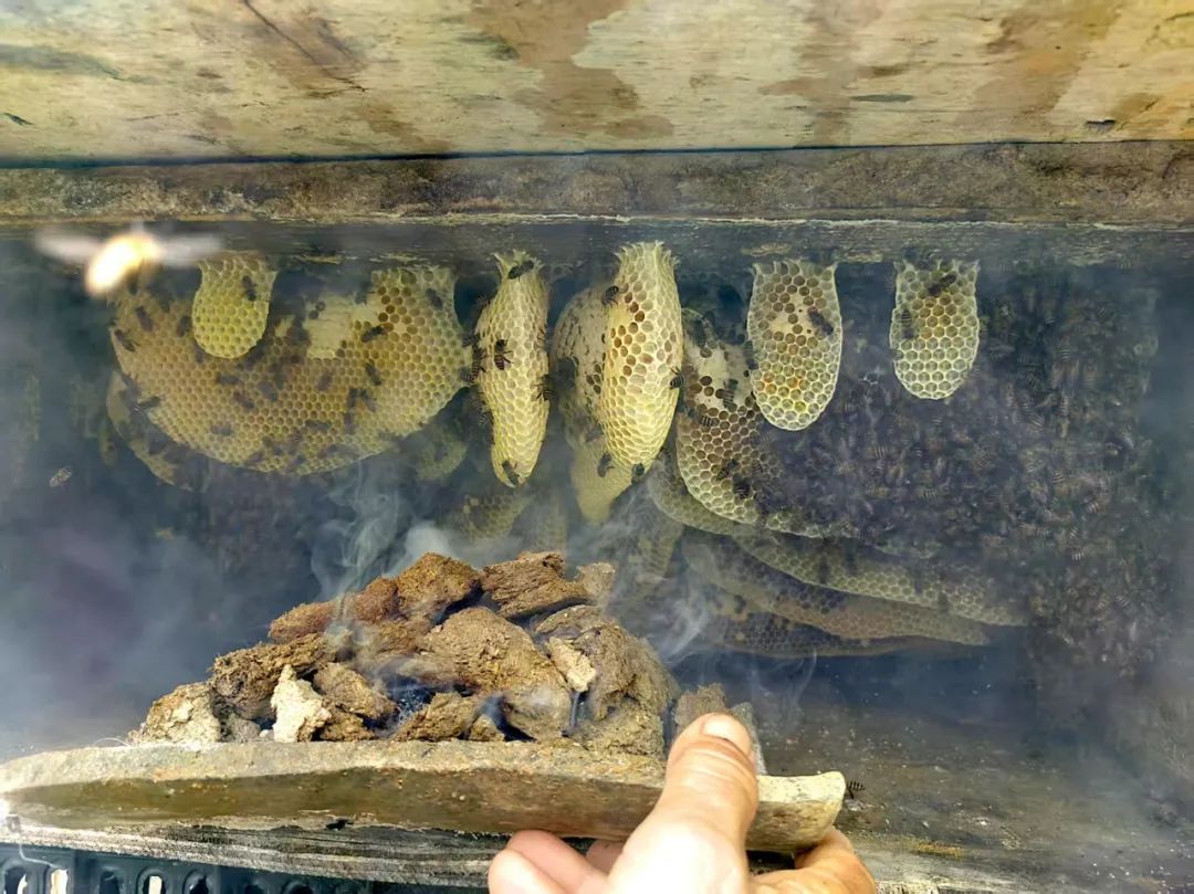 打开蜂桶前,轻轻将烟雾吹入桶内,就像是给蜜蜂们的暗号,让它们离开巢穴。打开蜂桶的那一刻,我被里面的蜂巢惊艳到了,主人家也不由得喜出望外,这距离上一次小满前取蜜,仅仅过去了两个月,勤劳的小蜜蜂们,又酿出了如此丰硕的甜蜜成果。