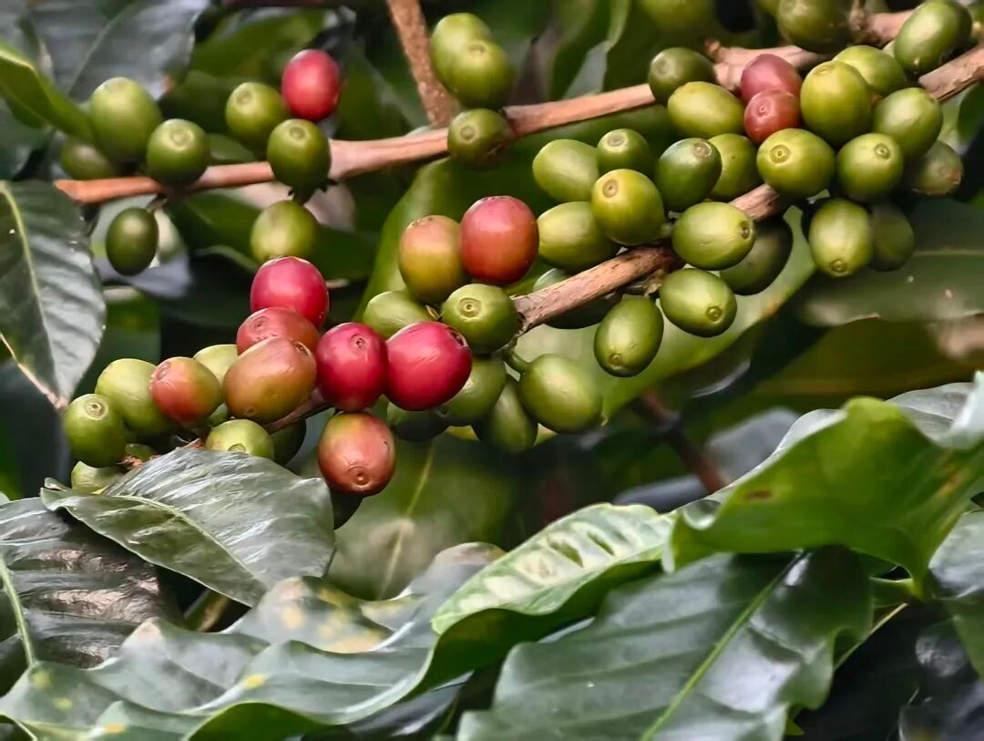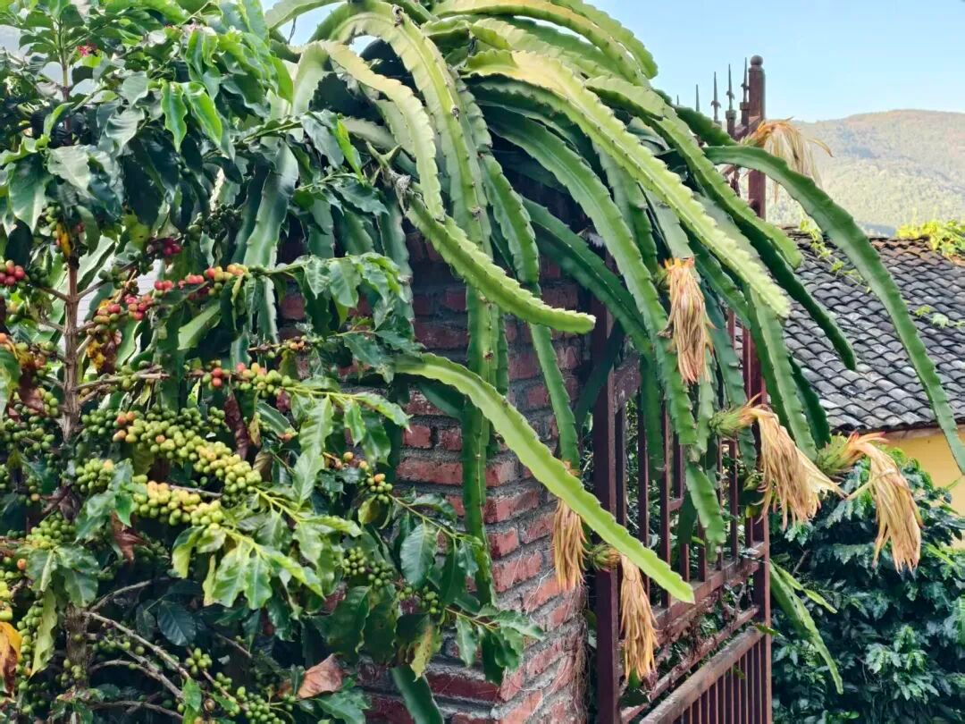 再往里走,咖啡树静静伫立,枝头挂满红褐色的咖啡豆,沉甸甸地垂着,仿佛承载着岁月的沉淀与土地的厚意。咖啡自二十世纪传入木城,曾被用作天然篱笆,如今却成了庭院中的风景与生活的滋味。春来,洁白的咖啡花悄然绽放,清香浮动;秋至,红果累累,摘下后经简单处理,便能焙炒出一杯醇香四溢的热饮。那一缕缕咖啡香在院中弥漫,是生活最踏实的暖意,也是木城人慢节奏的诗意。