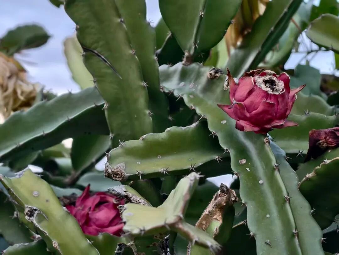 不远处,火龙果藤蔓攀墙而上,粉艳的果实如火焰般跳跃在土黄色的墙头,像缀满墙垣的宝石,热烈而温柔。在蓝天的映衬下,粉与黄的碰撞,既质朴又浪漫,令人驻足流连。只是此时已过头茬果的盛期,甜香稍减,人们也不再急于采摘,任其在枝头多留几日,反倒成了鸟儿们每日光顾的天然食坊。