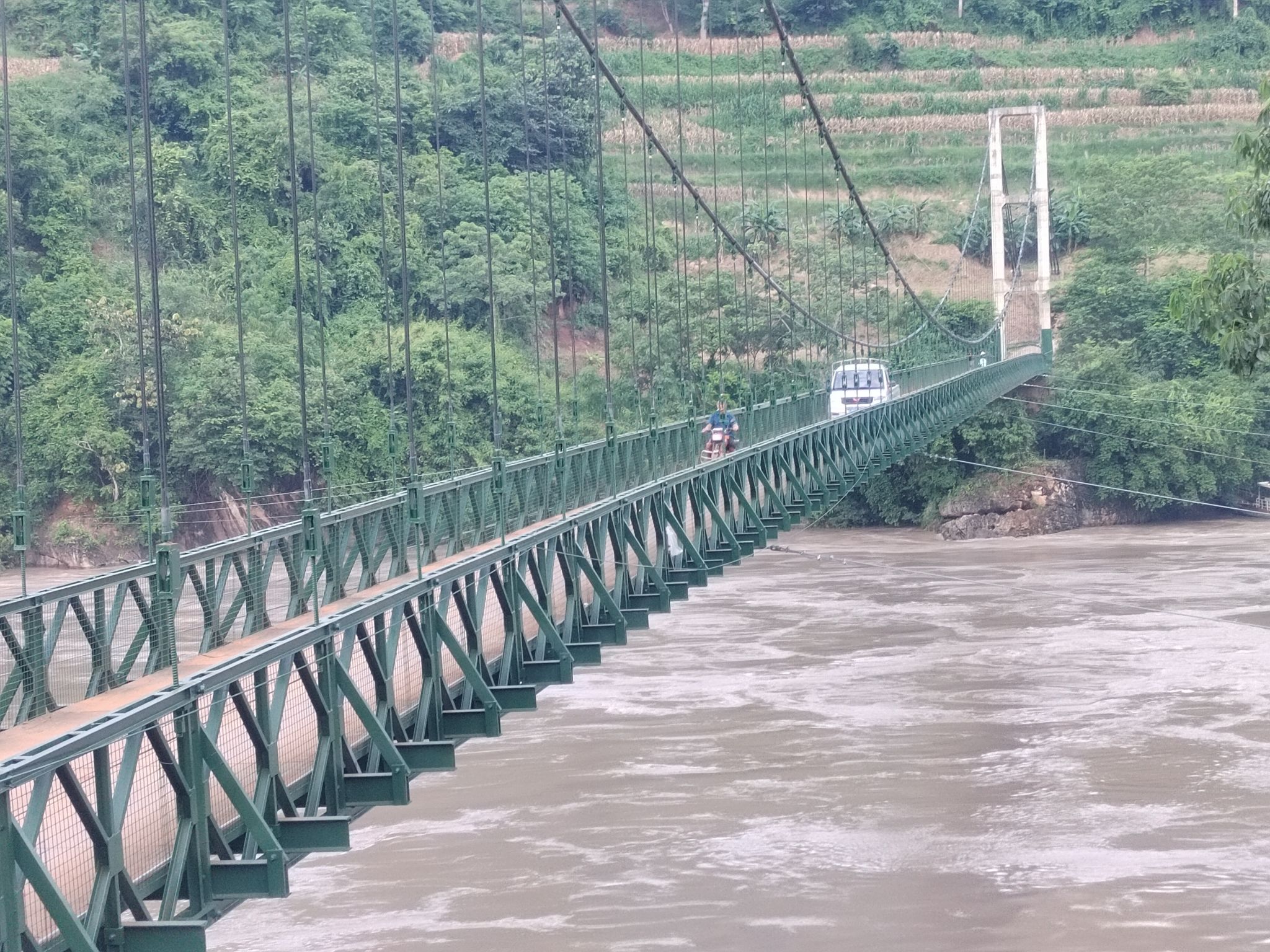 因金田吊桥建设时间久远,加上生产运输通行车辆过多,吊桥出现了伸缩缝破损严重、桥梁体裂缝超限等情况。2023年2月份实施了维修加固工程,更换了桥面板、破损贝雷架及吊杆,对桥梁钢结构进行除锈防护处治、桥梁混凝缺陷处治,修复了桥梁两侧护网及抗风索等,于7月5日维修完成顺利通车。
