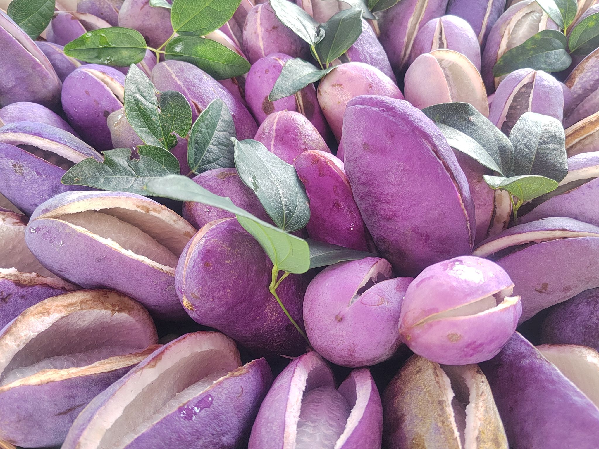 八月瓜又名“八月炸”“千斤包”,是木通科八月瓜属的常绿木质藤本植物,生于海拔1600~3600米的林缘,果实为不规则的长圆形或椭圆形,趋于成熟后由黄绿色变为红紫色,神似一个“胖娃娃”。当果壳自然裂开,就会露出长条糯白色的果肉,食之清香甘甜、生津止渴,是山区特有的一种野果。