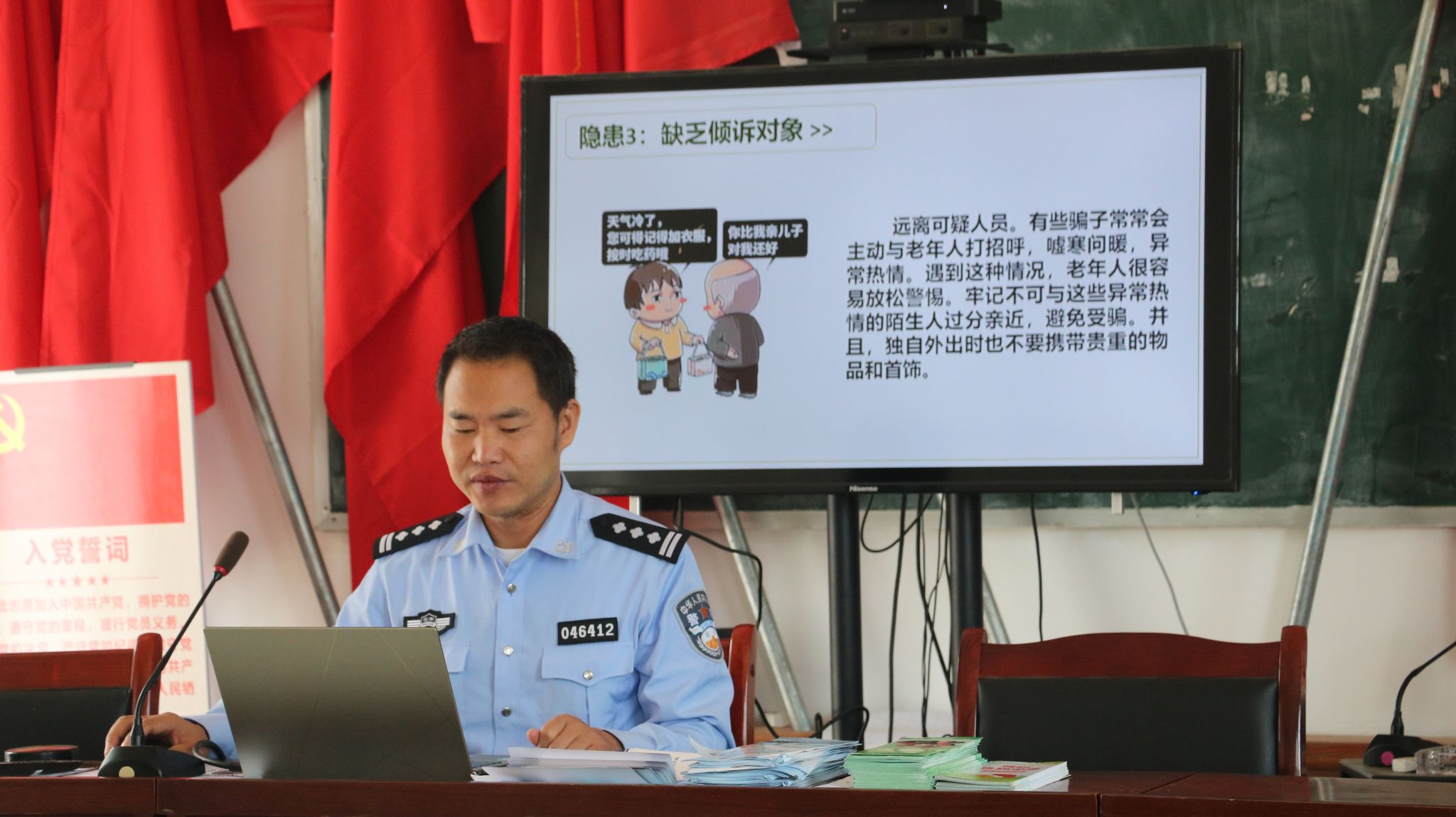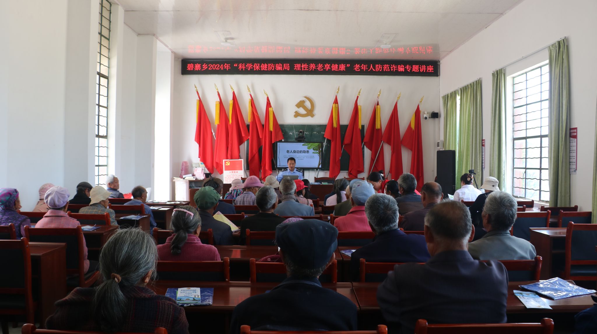 近年来,针对老年人的诈骗案件层出不穷,老年人防范意识薄弱,常常成为犯罪分子实施诈骗犯罪的对象,给广大老年人造成经济损失、精神痛苦,严重影响老年人身心健康、家庭和睦,引起社会不安定等多方面问题。为切实解决好老年人的烦心事、守护好老年人的“养老钱”,增强老年群体的防范意识,保障老年人群体合法权益,让广大老年人安享幸福晚年。5月23日,碧寨乡联合乡派出所在坡头村开展老年人防范养老诈骗知识讲座活动,全方位、多层次织好抵御养老诈骗保护网,营造安心、舒心的养老环境,用心用情用力守护好老年人的钱袋子。