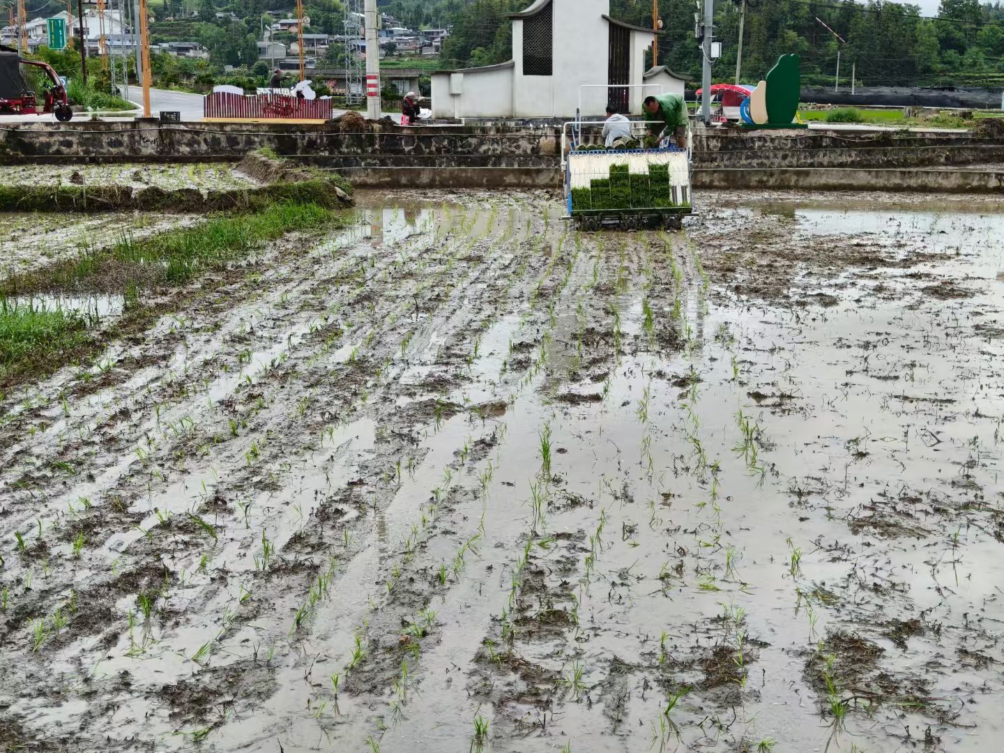 黄昏过后,经过一下午的机插耕作,龙江乡勐柳村30亩梯田换上了“绿装”。细雨缥缈,无声随风潜入每一株承载着愿景的秧苗,为龙陵水稻机械化技术革新画下缩影。